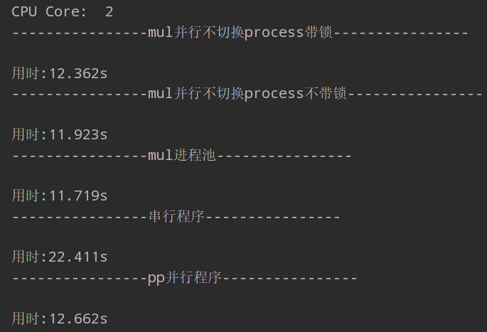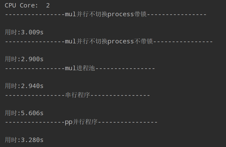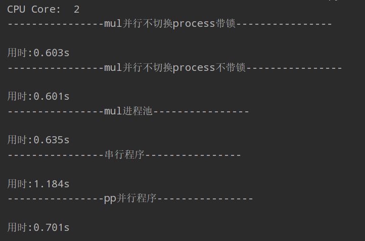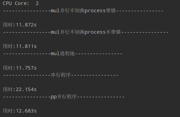 # mul并行不切换process不带锁 print("{beg}mul并行不切换process不带锁{beg}".format(beg='-' * 16)) startTime = time.time() inputs = inputs result_list = multiprocessing.Queue() plist = [] re_queue = multiprocessing.Queue() for i in inputs: re_queue.put(i) for i inrange(multiprocessing.cpu_count()): p = multiprocessing.Process(target=mains2, args=(result_list, re_queue)) p.start() plist.append(p) for i in plist: p.join() for i inrange(result_list.qsize()): input, result = result_list.get() # print("Sum of primes below %s is %s" % (input, result)) # print('+', end='') print("\n用时:%.3fs" % (time.time() - startTime))