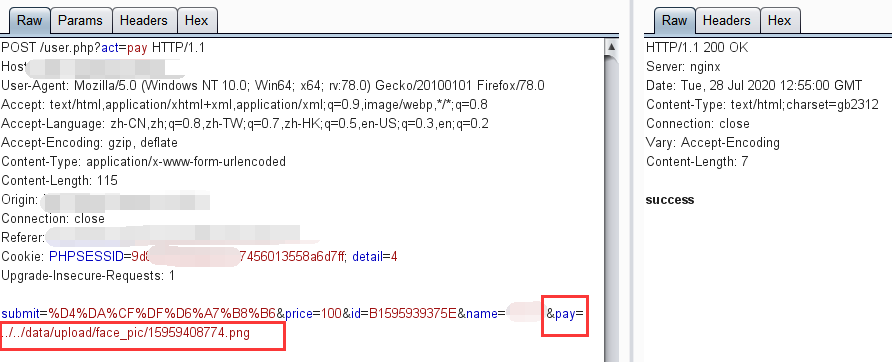 然后我们在POST里面增加一个pay参数,给这个参数赋值咱们上面上传的恶意图片路径(注意先目录穿越下../../)