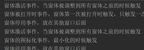 @Override public void windowActivated(WindowEvent e) { System.out.println("窗体激活事件,当窗体被调整到所有窗体之前的时候触发,获得焦点"); }