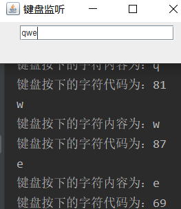 int code = e.getKeyCode(); System.out.println("键盘按下的字符内容为:"+c); System.out.println("键盘按下的字符代码为:"+code); }