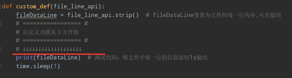 def custom_def(file_line_api): fileDataLine = file_line_api.strip() print(fileDataLine) time.sleep(1)