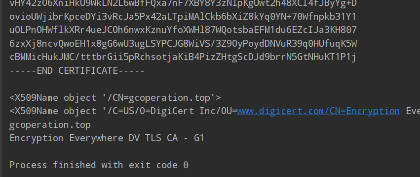 if __name__ == '__main__': hostname_ip = "www.xw.pw" port = '443' issuedDic = _get_cert_from_endpoint(hostname_ip,port) if issuedDic == None: print("未找到ssl信息") else: print(issuedDic['cert']) print(issuedDic['subject']) print(issuedDic['issuer']) print(issuedDic['issued_to']) print(issuedDic['issued_by'])