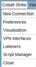 1 2 3 4 5 6 7 New Connection #新的连接(支持连接多个服务器端) Preferences #偏好设置(设置Cobal Strike界面、控制台、以及输出报告样式、TeamServer连接记录等) Visualization #窗口视图模式(展示输出结果的形式) VPN Interfaces #VPN接入 Listenrs #监听器(创建Listener) Script Manager #脚本管理 Close #关闭