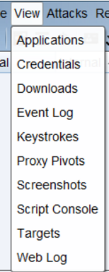 1 2 3 4 5 6 7 8 9 10 Applications #应用(显示受害者机器的应用信息) Credentials #凭证(通过hashdump或Mimikatz抓取过的密码都会储存在这里) Downloads #下载文件 Event Log #事件日志(主机上线记录以及团队协作聊天记录) Keystrokes #键盘记录 Proxy Pivots #代理模块 Screenshots #截图 Script Console #脚本控制台(可以加载各种脚本,增强功能https://github.com/rsmudge/cortana-scripts) Targets #显示目标主机 Web Log #Web日志