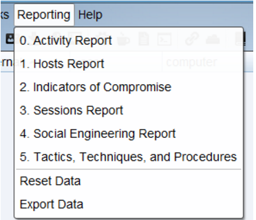 1 2 3 4 5 6 7 8 0. Activity report #活动报告 1. Hosts report #主机报告 2. Indicators of Compromise #威胁报告 3. Sessions report #会话报告 4. Social engineering report #社会工程学报告 5. Tactics, Techniques, and Procedures #策略、技巧和程序 Reset Data #重置数据 Export Data #导出数据