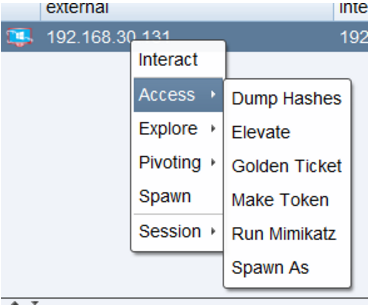 1 2 3 4 5 6 Dump Hashes #获取hash Elevate #提权 Golden Ticket #生成黄金票据注入当前会话 Make token #凭证转换 Run Mimikatz #运行 Mimikatz Spawn As #用其他用户生成Cobalt Strike侦听器