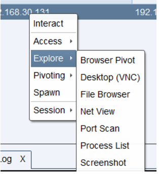 1 2 3 4 5 6 7 Browser Pivot #劫持目标浏览器进程 Desktop(VNC) #桌面交互 File Browser #文件浏览器 Net View #命令Net View Port Scan #端口扫描 Process List #进程列表 Screenshot #截图